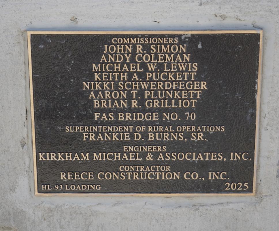 Straw blankets have been placed to grow grass when it rains again. A plaque was placed on the side wall of the bridge honoring those who took part. The plaque includes Commissioners John R. Simon, Andy Coleman, Michael W. Lewis, Keith A. Puckett, Nikki Schwerdfeger, Aaron T. Plunkett, and Brian R. Grilliot. EAS Bridge No. 70, Superintendent of Rural Operations Frankie D. Burns, Sr., Engineers, Kirkham Michael & Associates, Inc., Contractor Reece Construction Co., Inc., and the year the project was commissioned, 2023.